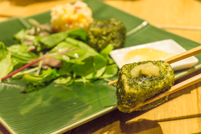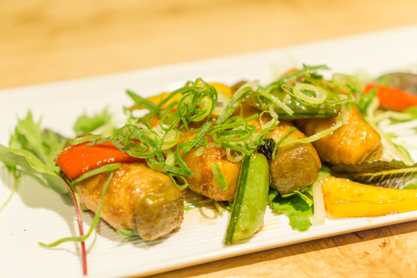 豆腐と白身魚のすり身を湯葉で巻いて揚げた湯葉揚げという梅の花オリジナルの品をあられと海苔でアレンジし、三つの味を楽しんでいただけるようにしました。梅の花ではレモンを絞ってお召し上がりいただいてますがTSUMUGIでは流行りの塩レモンを添えてます。