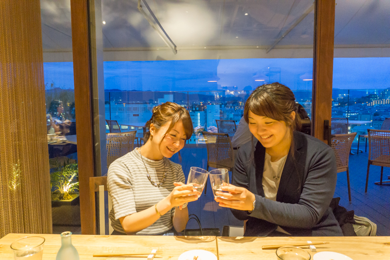 左から招徳酒造の大塚さん、取材でいらっしゃっていたFM802DJで最近枚・かた男を推していただいた鬼頭さん。美味しい料理に会話も弾みます。
