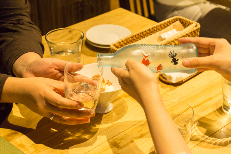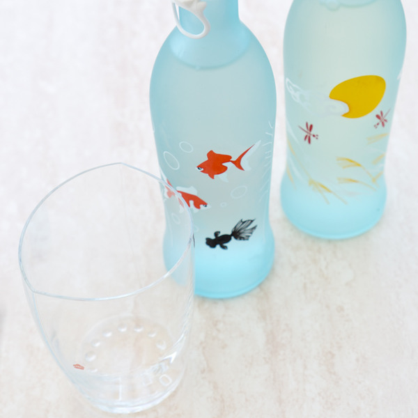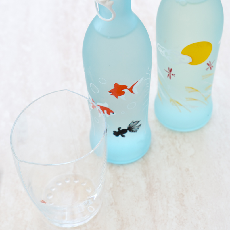 春夏秋冬でボトルデザインが変わる日本酒。(金魚が描かれたボトルが夏バージョンの “夏の戯れ”、すすきと月が描かれているのは秋にお目見えする“月の詩” )