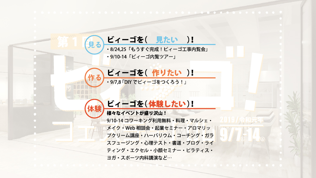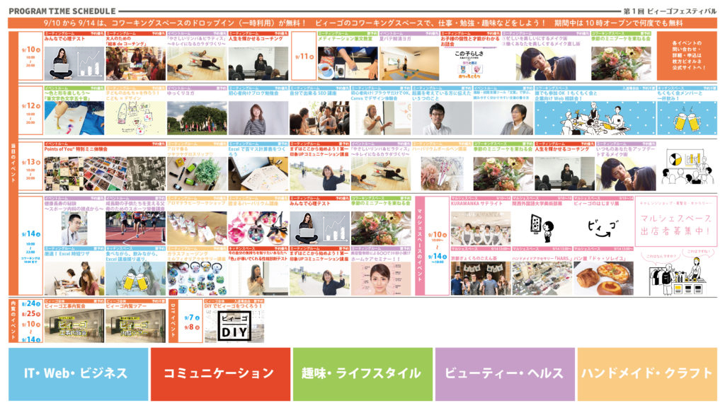 9/10〜14 10:00〜20:00(9/14のみ22:00) コワーキング無料体験、ビィーゴ内覧ツアー、体験イベント、トークイベント・交流会、マルシェ、お昼ごはん・お茶会