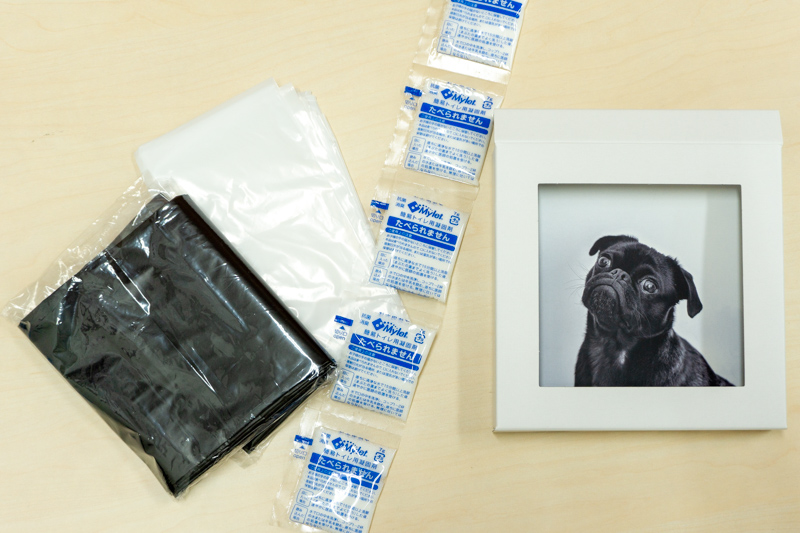額に見立てられたボックスを開くと、凝固剤、中が見えない黒い袋、白い外袋が入っています。