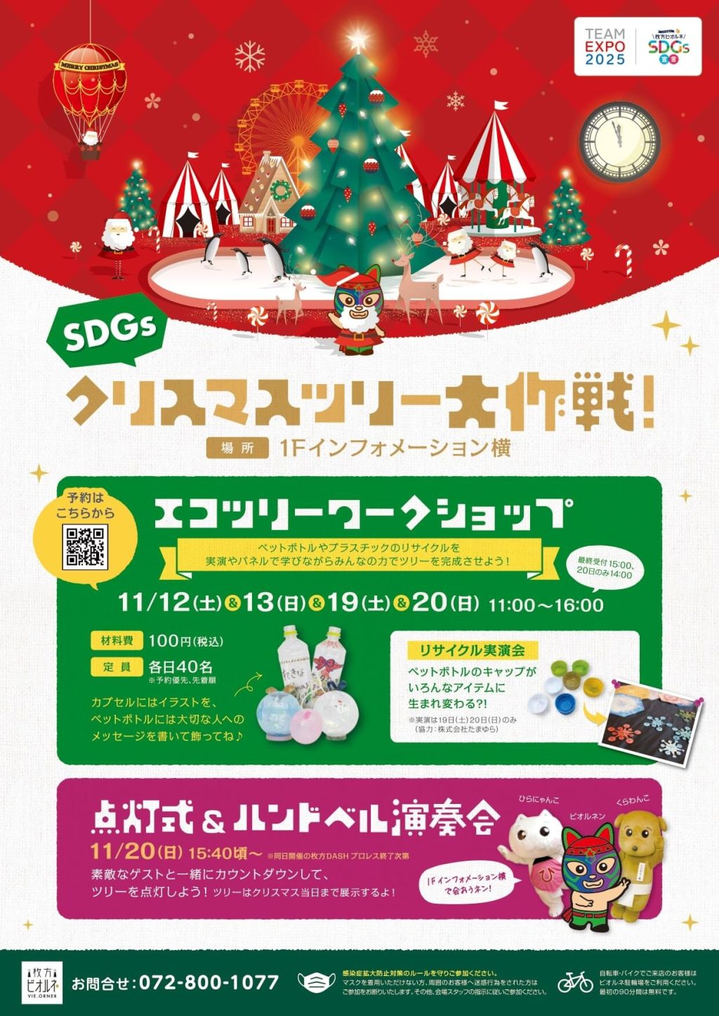 枚方の観光大使くらわんこや、ひらにゃんこ、枚方のヒーロービオルネンなどのゲストと一緒にツリーの点灯を楽しみましょう!
