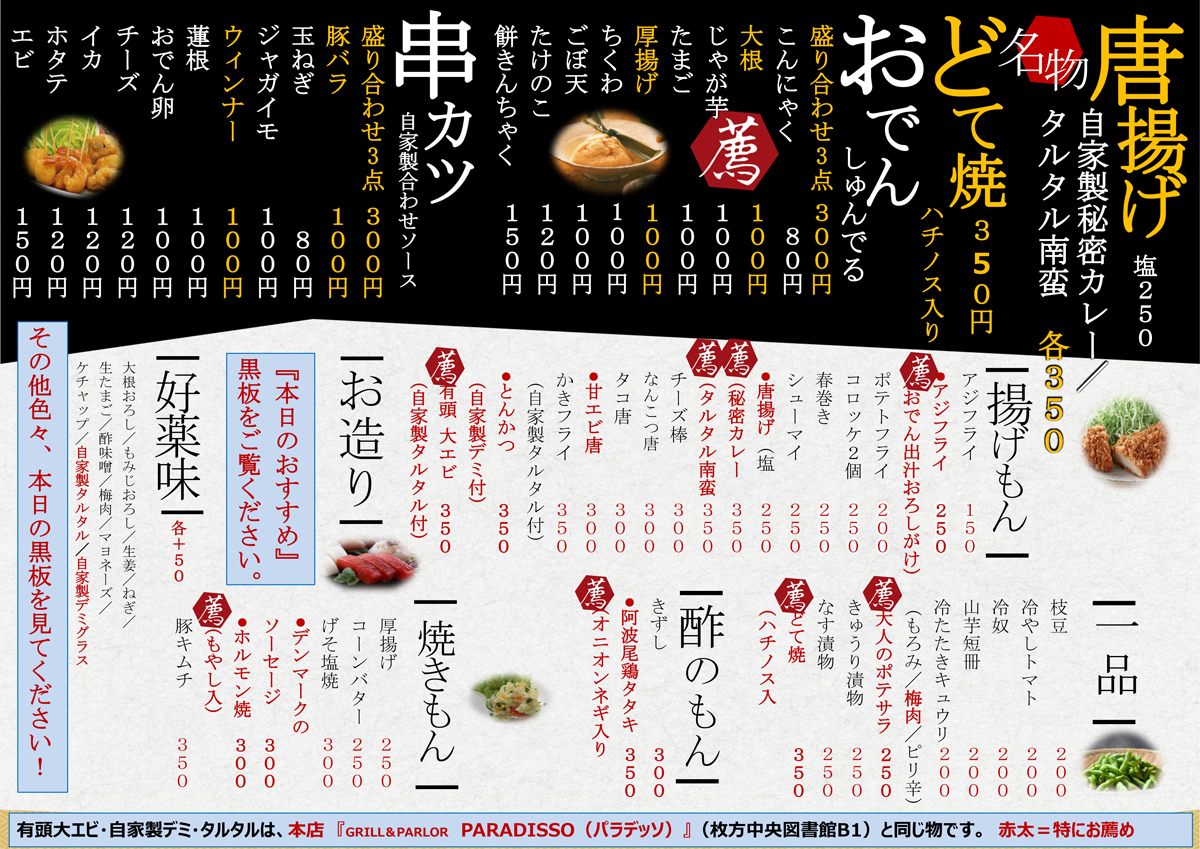 カトゥーうちのメニューは全100種類以上!美味しい!! 安い!! 多い!! の三拍子やで。どうせ迷うから料理も適当に出したるわ。