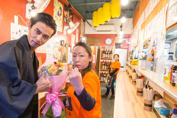 写真左から夢屋店長のアンチャン・かた男・スタッフのあゆみさん。枚・かた男自慢の「ざぶざぶポーズ」は却下されました。