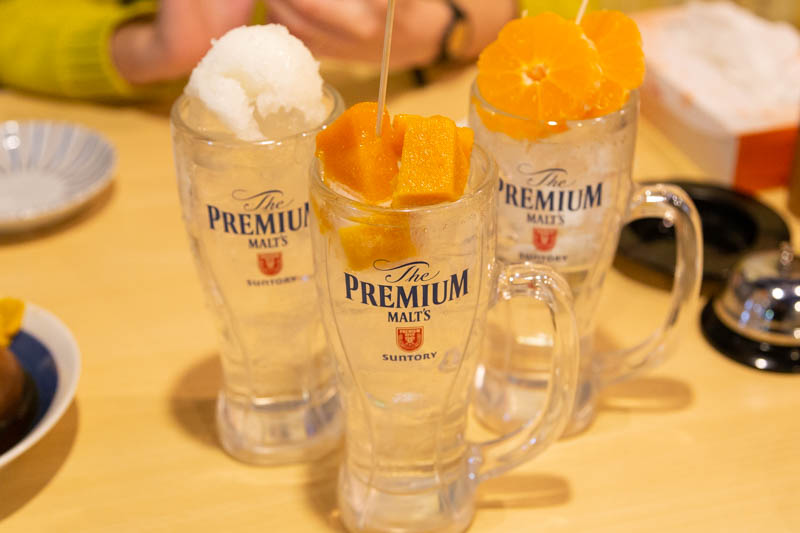ということで注文したのは、チューハイフローズンレモン(左:ナーガ)、マンゴー(中央:デンチュウ)、みかん(右:撮影で同行したシュン)