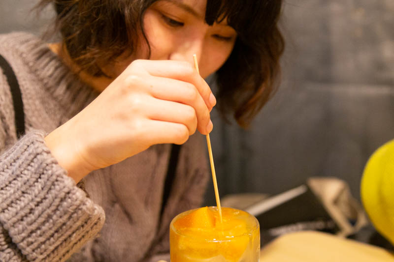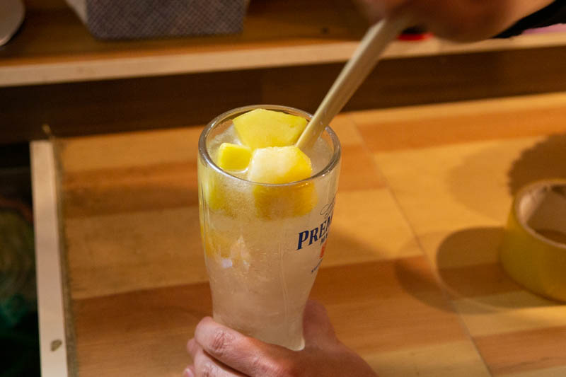 常連のY子さんが実際にパインチューハイをかき混ぜているようす