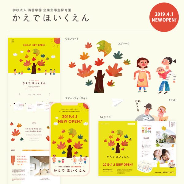 2019年4月に大阪府枚方市に新設される、 かえで保育園。平岡さんはロゴとA4広告、Webサイトを作成。広告を配ると同時に、多数のご相談やご応募があったそう。