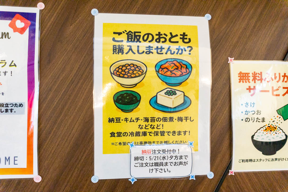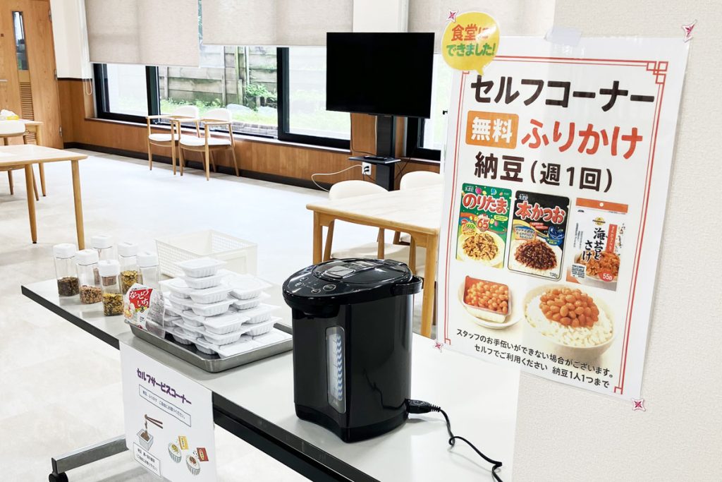 例えばふりかけを毎日無料で選べたり、週に1回納豆を無料で追加できるコーナーを用意したり、希望の方にはキムチや海苔の佃煮などのご飯のお供を追加購入できるようにしています!