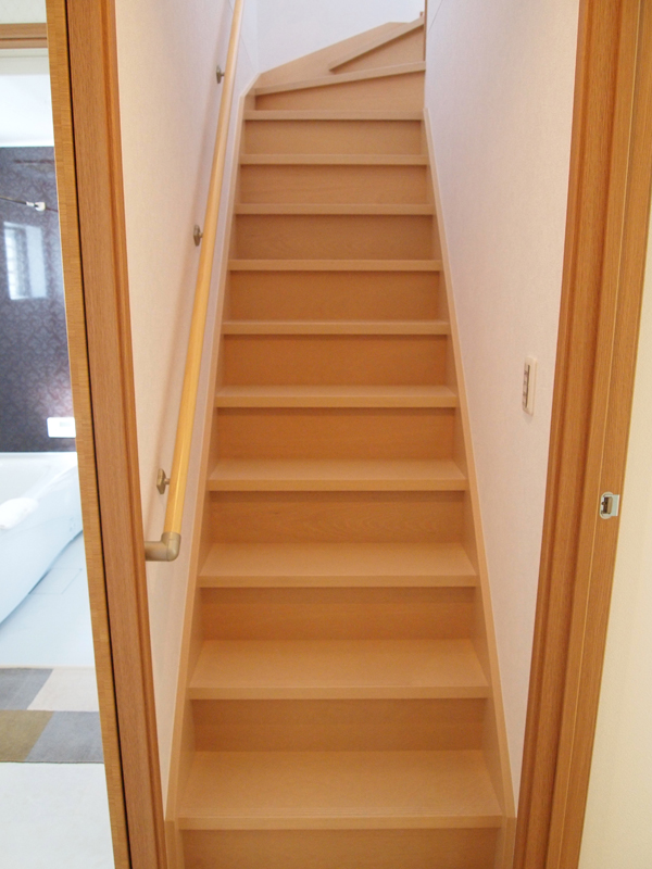 廊下を進むと階段。2階は後ほど紹介するのでまずは階段左から。