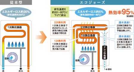 従来の給湯器に比べ熱効率を飛躍的に高めます。