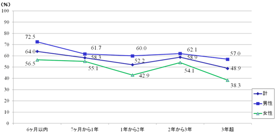 フリーター期間が半年以内の場合、男性では約7割、女性では約6割が正社員になっていますが、フリーター期間が3年を越える場合、正社員になれた率は男性で約6割、女性で約4割であり、フリーター期間が長いと正社員になることが難しくなるといえます。