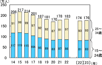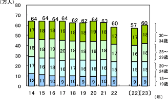 ニートの状態にある若者は平成14年以降60万人台で推移し、平成23年は60万人となっています。