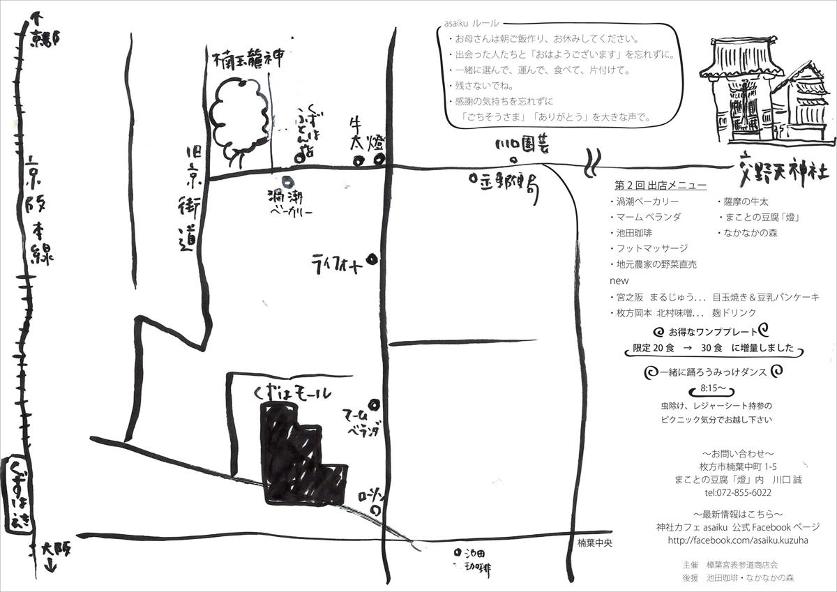 2013年8月18日(日)の朝8:00~11:00に「asaiku (あさいく)」という朝ごはんカフェが交野天神社で開催されます