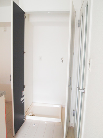 キッチンの後ろに収納タイプの洗濯機置き場が。使用しない時は扉を閉められるので生活感を感じさせません