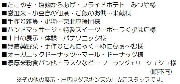 日頃ダスキン天の川支店とお付き合いのあるお店などが出店し食べ物や雑貨を販売、縁日にあるような懐かしいゲームコーナーでは子供も遊べます。また抽選会やダスキンの商品が並ぶブースなど盛りだくさん!