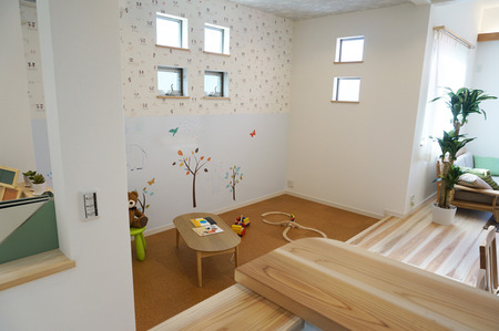 病院や車屋さんなどによくあるキッズコーナーを自宅に完備。このスペース内なら多少おもちゃが散らかっててもあまり気にならなそうです。