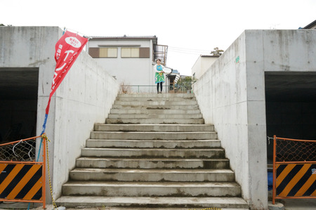 今日も天の川河川敷に足を突っ込んでしまい、ドロドロになって帰ってきた長男マサオ。階段の上から