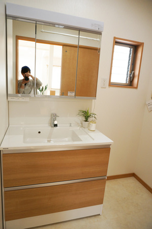 パントリーの写真にチラッと見えているのですが、洗面室にも収納棚があります。可動棚なのでお好みで高さなどを変えることができます。