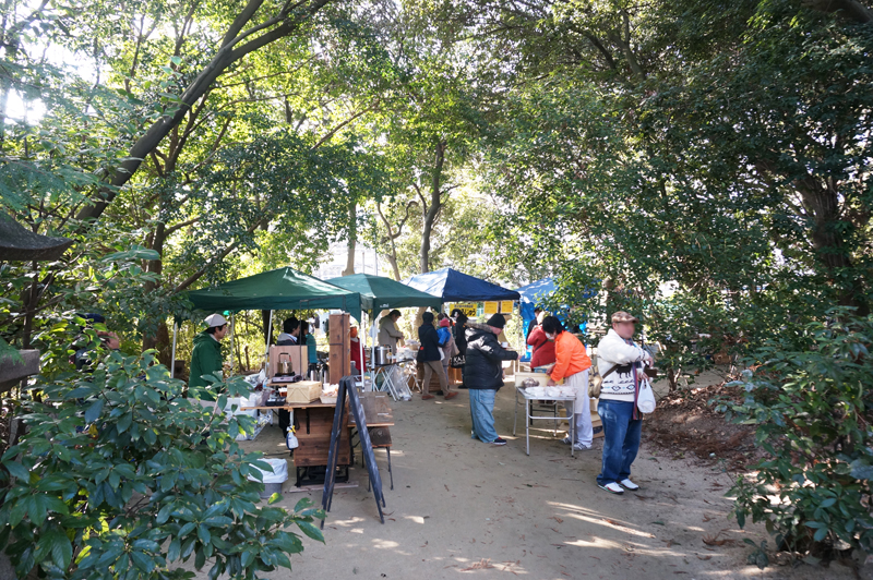 木漏れ日のもと、地元のおいしいお店がずらっと並びます。