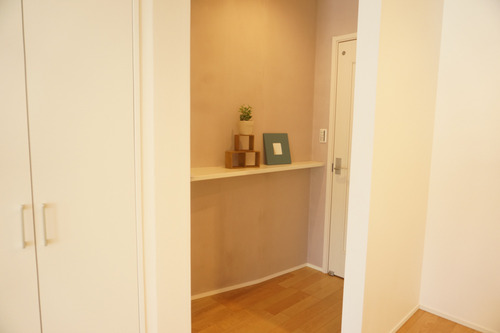 トイレ手前はちょっと仕切ってあって、飾り棚もあります。お客さんにさりげなくお披露目したい家族の作品をそっと置いておきたいですね