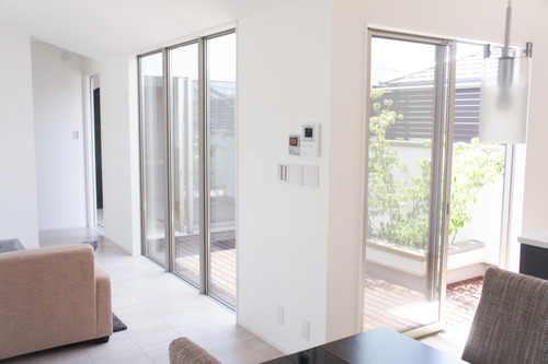 2階にリビングやキッチンを持ってくることで、外からの視線を全く気にしなくていいので、大きな窓を両サイドにもってくるという大胆なデザインを実現