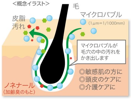 マイクロバブルトルネードは、3μmの泡が毛穴の中に入り洗浄。