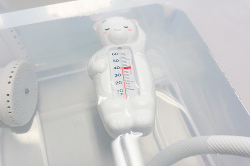 マイクロバブルに浸かりっぱなしの美白クマ(羨ましい!)の温度計は40℃でしたが、バブルを起動させていると、もっと温かく感じました!だから低温でも、のぼせること無く温まれるんですね。