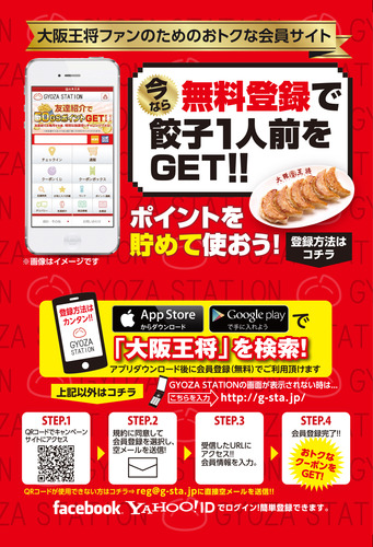 大阪王将ファンのためのおトクなモバイル専用会員サイトであるGYOZA STATIONに登録するだけで新!元祖焼餃子1人前無料券がもらえたり、登録でもらえるポイントで、最大1,000円引クーポンを手に入れることが出来たり、お気に入り店舗登録すればそのお店のキャンペーン情報などメールで送られて来たり…と嬉しいサービスが続々登場!