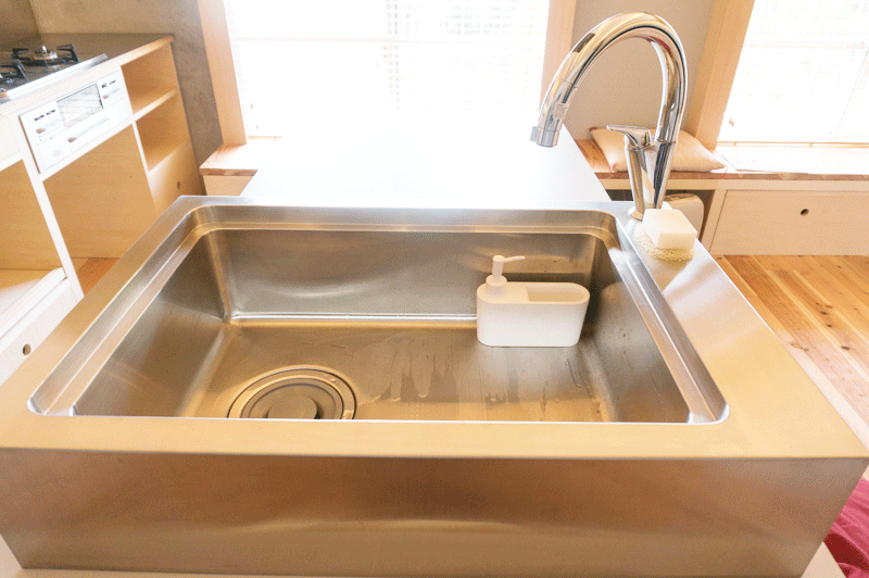 シンクも使いやすい広さ。テーブルはダイニングにも調理台にも使える位置にあります。
