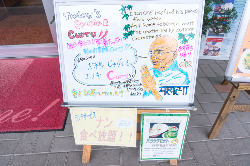 お店の前にはこんな看板が。ガンジー(おそらく)の絵がめっちゃうまい!!