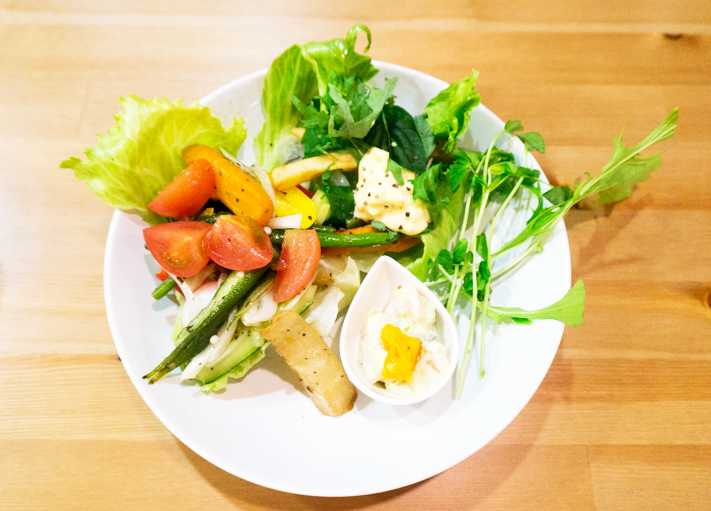 ベビーリーフ、豆苗、にんじん、大根、水菜、オクラ、トマト、レタス、キュウリ、じゃがいも、アボカド、しめじ、玉ねぎ、パプリカ赤&黄 の15種類の野菜が使用されたサラダ。