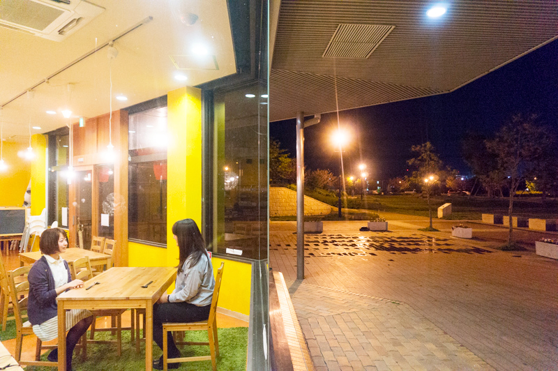 外から見たらこんな感じ。ちょっと分かりにくいですが、ちょうど真ん中あたりが窓ガラス。ここは大阪市内、と言っても違和感ないくらいにオシャレですが、枚方ですよー
