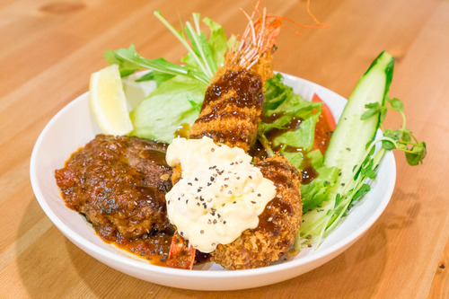 ライス・週替わりスープ・ホタテのクリームコロッケ・エビフライ・サラダ・デザートが基本のセット。しかも…ディナーでも食べられます!メインのおかずが4種類から選べます。各1,050円(税込)