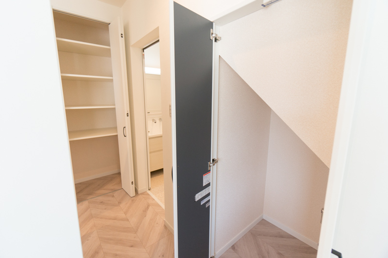 こちらは少し落ち着いた色の木材です。サイドにはシューズクローク。