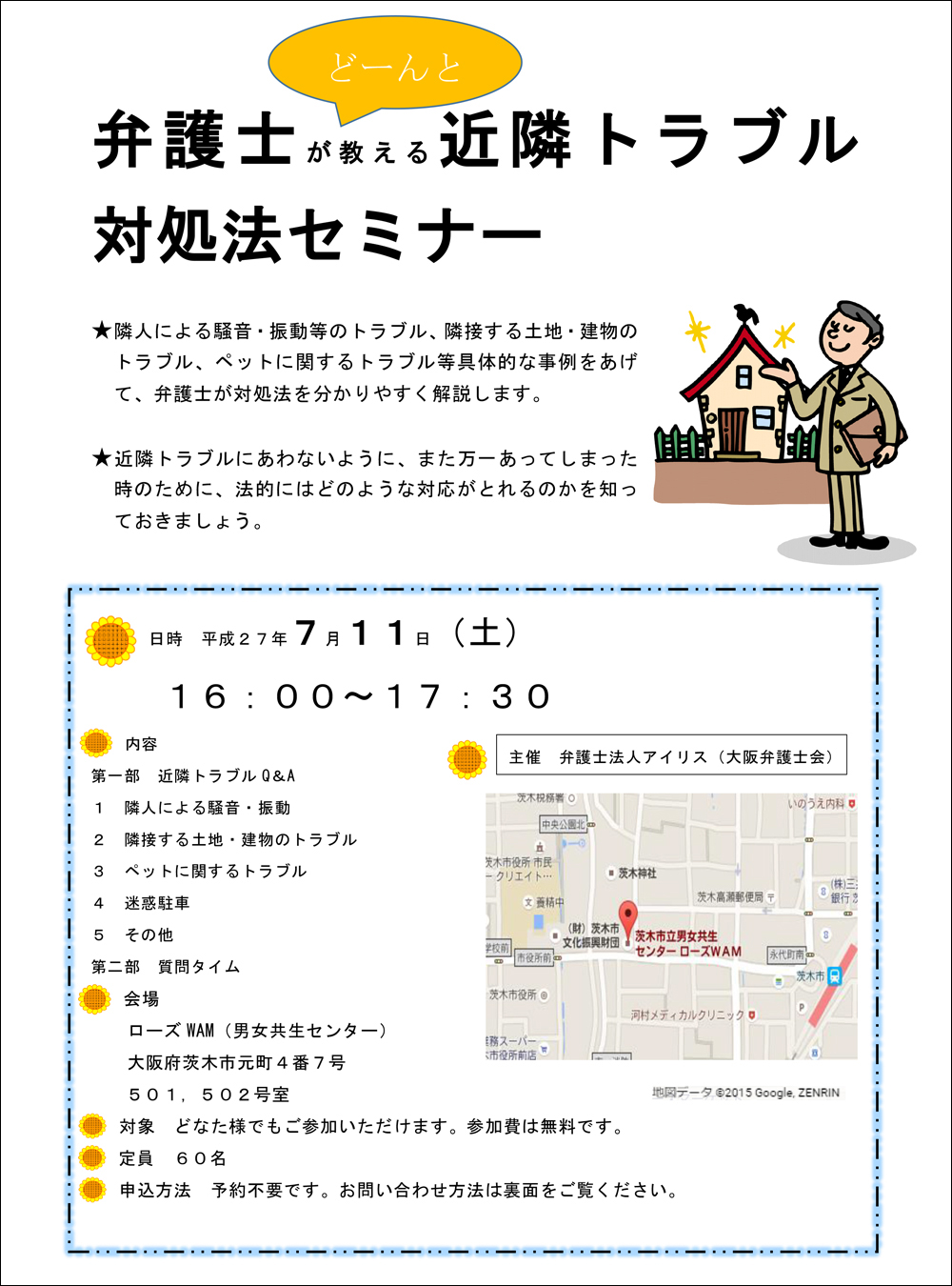 ふろ&ばばっちみたいになる前に(ホントは仲良しですよ〜笑)一度キチンと学んだ方が良さそうですね!そんな「もしも」に備えて近隣トラブルの対処法を学べるセミナーが7/11(土)に参加無料で開催されるんです!