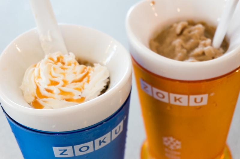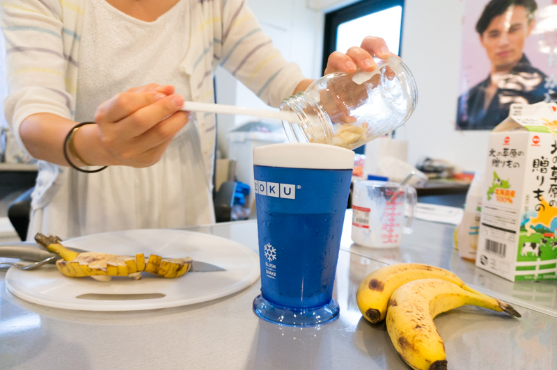 今回の試飲会で使用するのはZOKU。ZOKUという専用の容器を冷凍庫で8時間くらい冷凍しておき、そこに液体を入れてしばらく混ぜ混ぜすると、シャーベットになっちゃうという今の季節にピッタリの商品なんです![]()