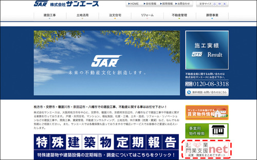 サンエースHPの右下、赤い点線枠で囲った部分が起業・開業をまとめてサポートする起業開業支援net。