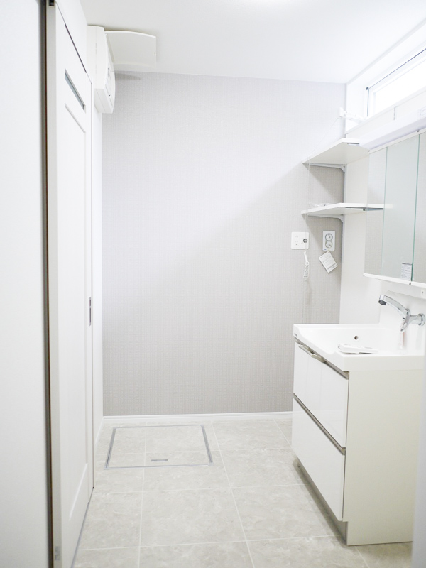「洗面室は広めにとって、この写真の反対側のスペースにお手持ちの収納棚を置けるように設計しました!」