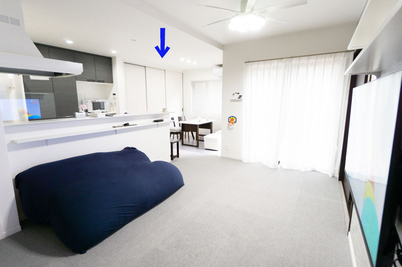 「そしてこのダイニングの青矢印部分にも収納があるんです!」