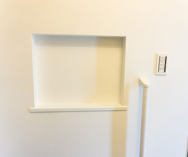 「洗面室にはこのようなスクリーンカーテンを取り付けできるよう、下地を入れてもらいました。