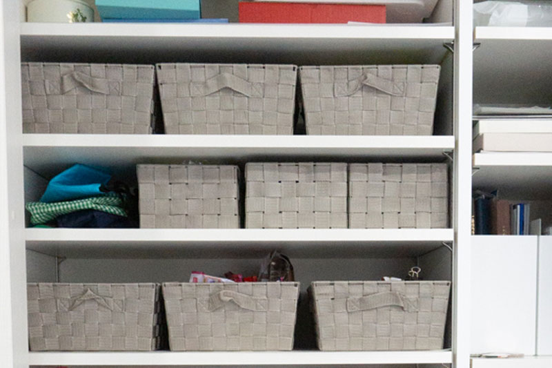 「ケースを統一して並べたかったのでニトリや無印で揃えて収納しています。