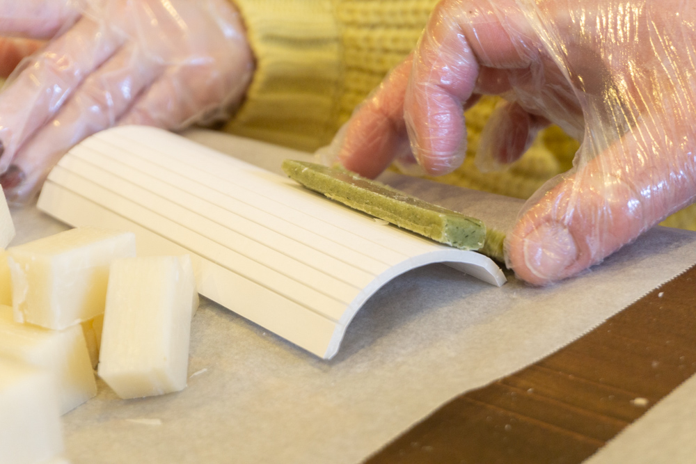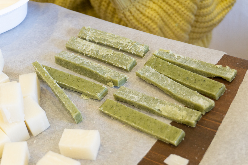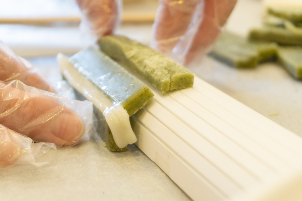 それをこんな風によもぎ餅・糊餅・よもぎ餅・糊餅と交互にくっつけてもらえます?