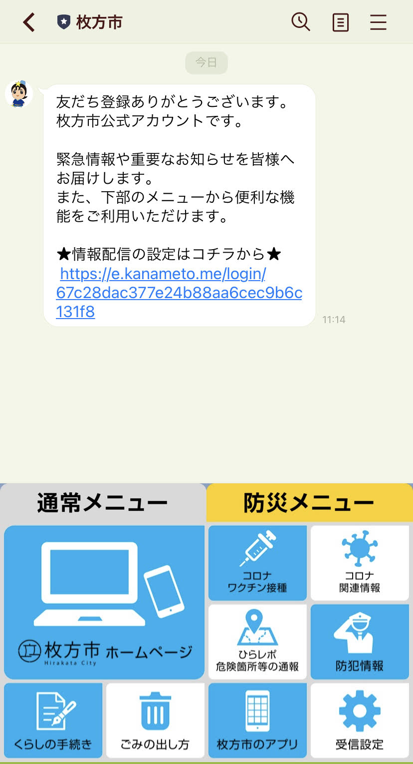 枚方市はLINE公式アカウントもあり、コロナワクチン接種や防犯情報などに簡単にアクセスすることが出来ます。