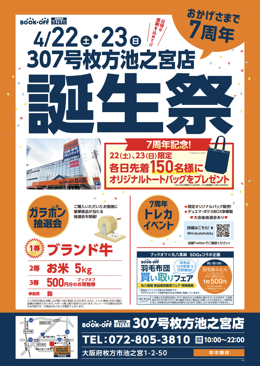 この4月で枚方市池之宮にあるブックオフスーパーバザー 307号枚方池之宮店(以下、枚方店)は7周年、守口市佐太東町にある、ブックオフスーパーバザー守口ジャガータウン店(以下、守口店)は10周年を迎えます。