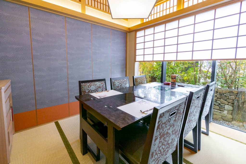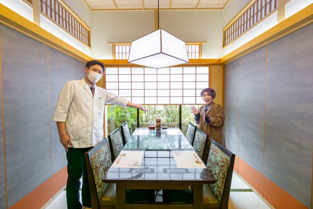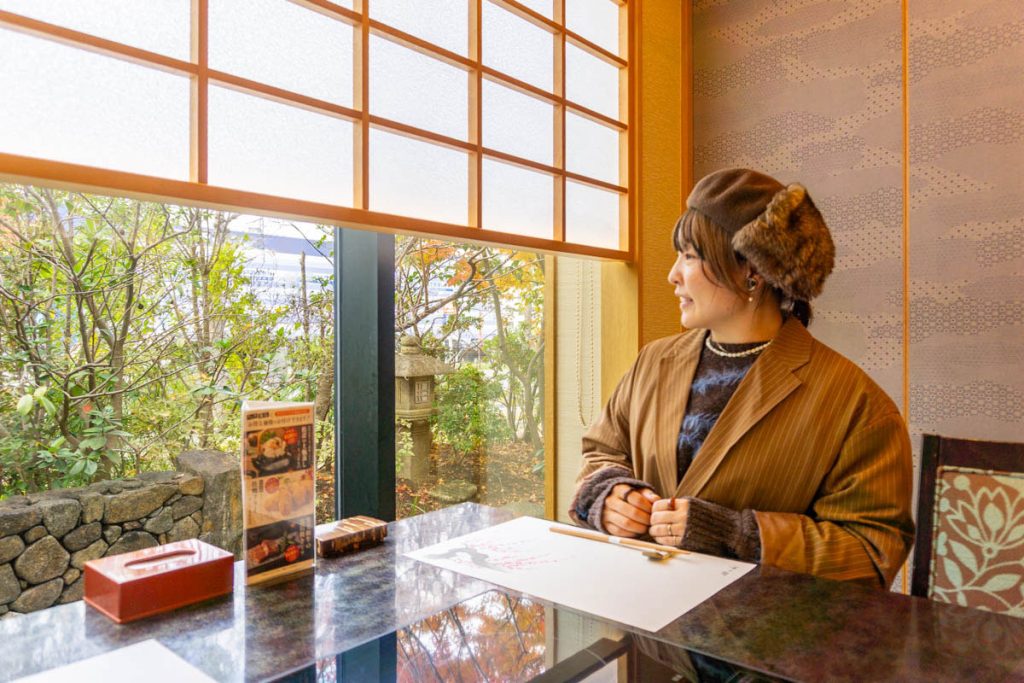 外からの目線が気になる位置は障子で目隠ししてあるので、景色やお食事をゆっくりと楽しめるようになっています。