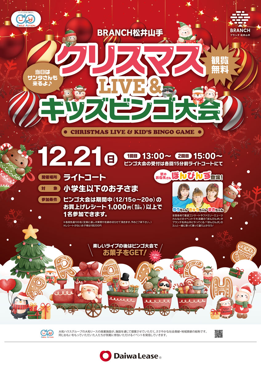 ※ビンゴ大会は期間中(12/15(月)〜20(土))のお買上げレシート1,000円(税込・合算可)以上で小学生以下のお子様1名参加できます。