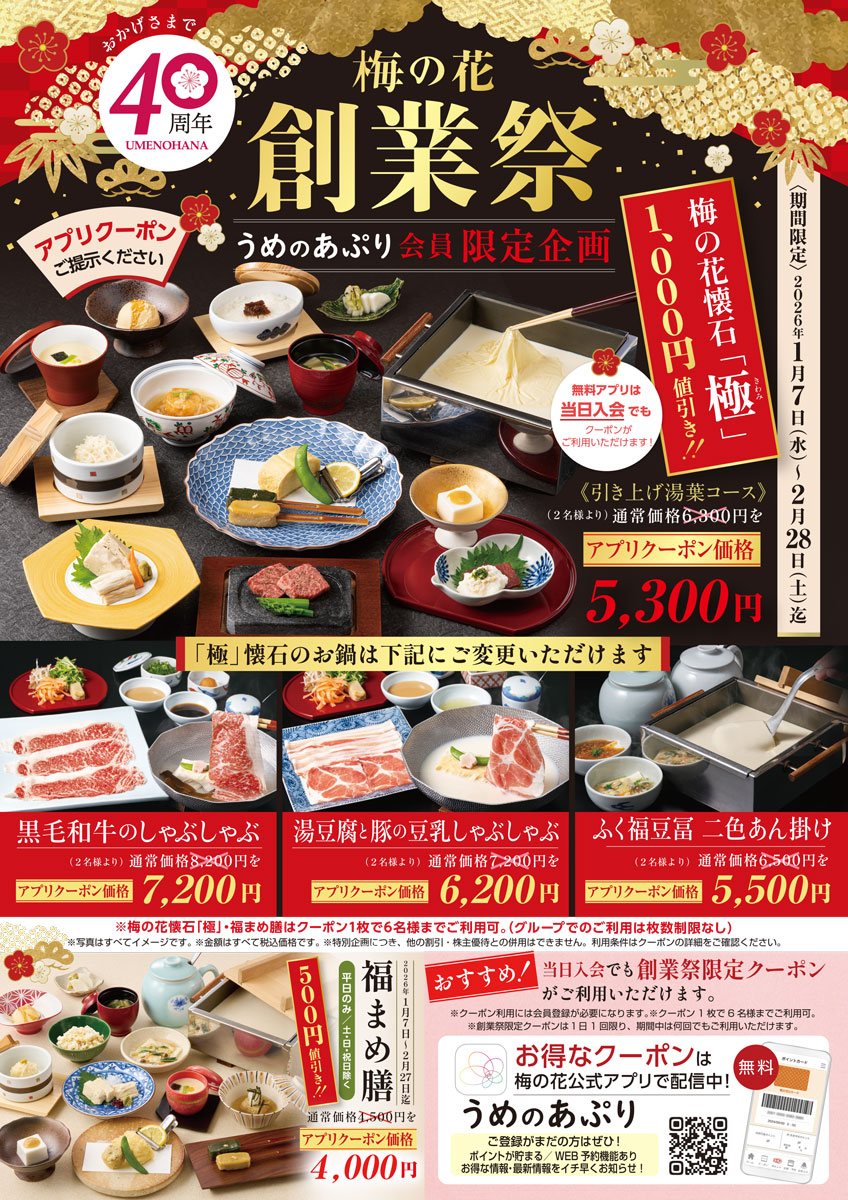 また、おかげさまで梅の花は40周年を迎え、感謝を込めた創業祭を開催することになりました!