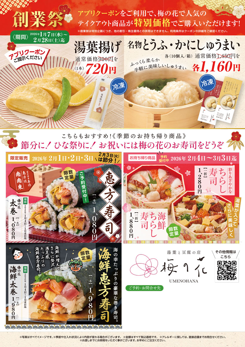 2026年1月7日(水)〜2月28日(土)は、うめのあぷり会員様限定でお料理やテイクアウト商品をおトクにご購入いただけます!
