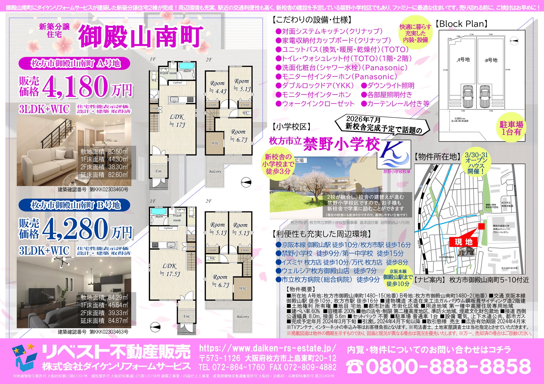 近隣には関西外国語大学 御殿山キャンパス、そして2026年に新校舎が完成する禁野小学校が校区で徒歩3分です。