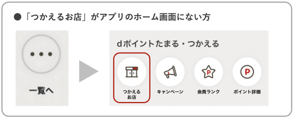 まずはアプリのホーム画面、もしくは「一覧へ」を選択し「つかえるお店」をタップ!